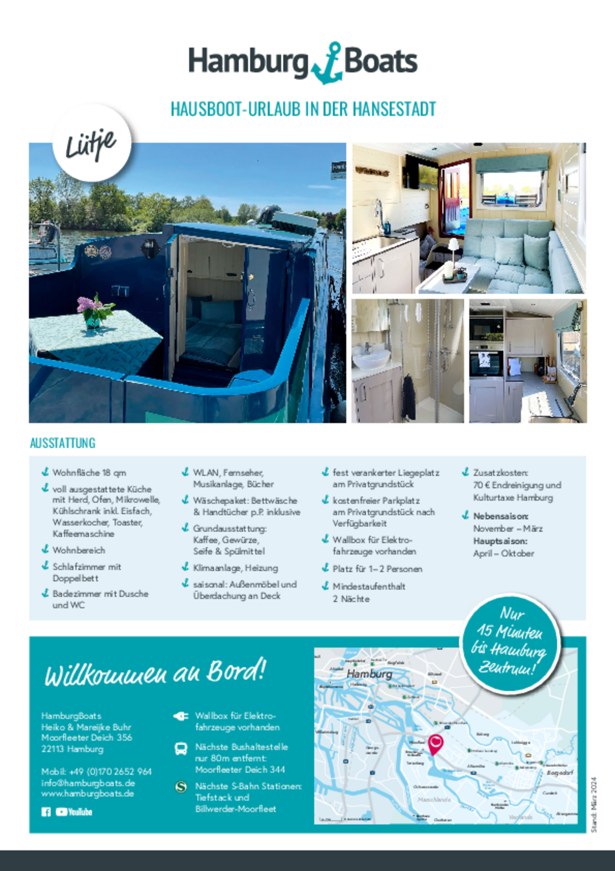Auf knappen 30 Quadratmetern bietet unsere schwimmende Ferienunterkunft eine maritime Atmosphäre und jeglichen Komfort: von W-Lan, Sat-TV, Klimaanlage/Heizung, Badetreppe, Musikanlage bis hin zu einer gemütlichen Koje, einem begehbaren Bad und einer voll ausgestatteten Wohnküche bieten wir Ihnen eine Unterkunft der besonderen Art.