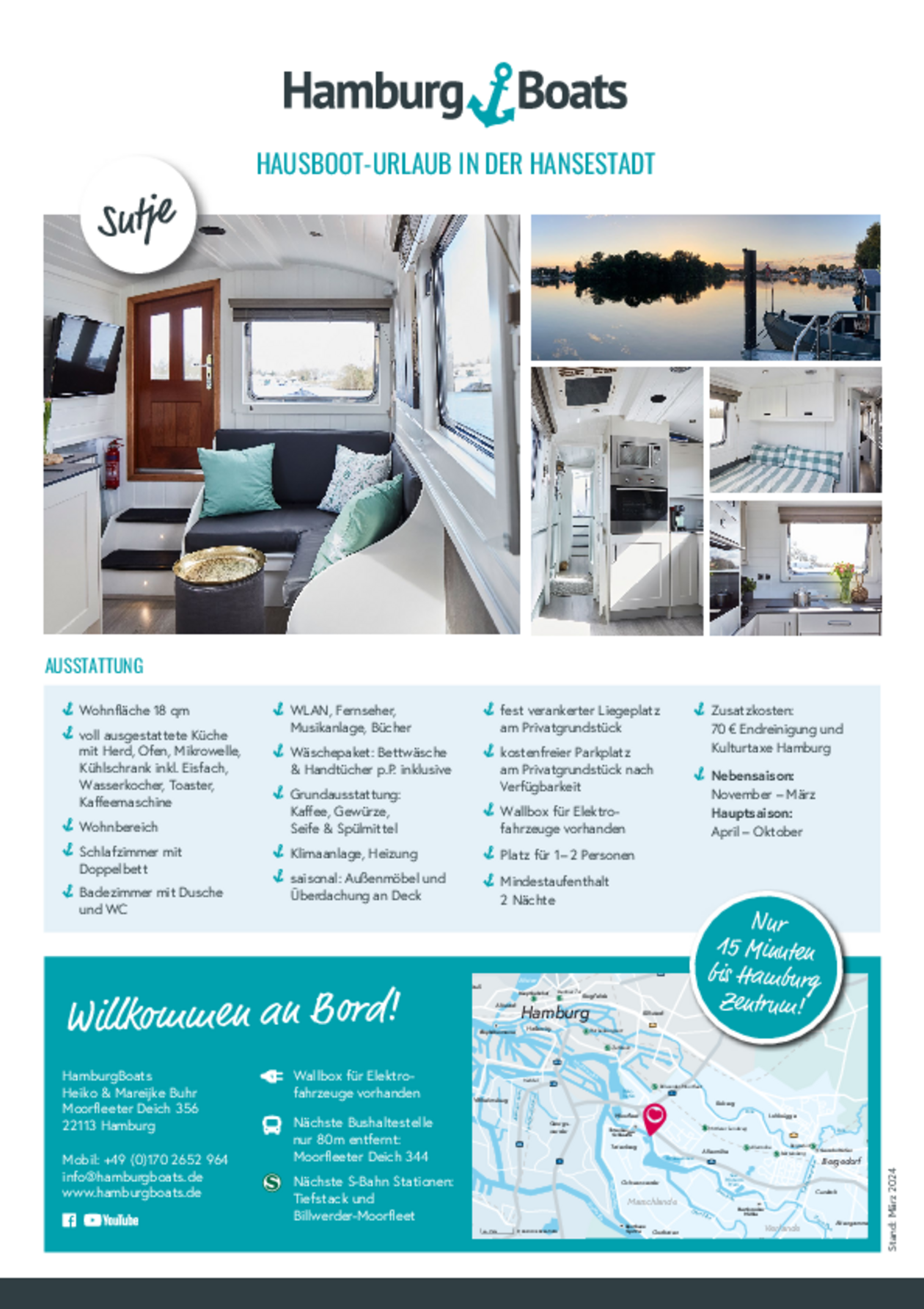 Unser Premieren-Hausboot, mit dem alles anfing. 2019 in England gebaut und zuhause von uns final ausgestattet ist sutje unser ganzer Stolz, denn hier konnten wir alle Ideen und Ansprüche verwirklichen und seit 2020 bereits vielen Gästen eine schöne Auszeit auf dem Wasser bieten. Auf knappen 18 Quadratmetern bietet unsere schwimmende Ferienunterkunft eine maritime Atmosphäre und jeglichen Komfort, sodass ihr bei eurer Auszeit vom Alltag auf nichts verzichten müsst. Von W-Lan, Sat-TV, Klimaanlage/Heizung, Badetreppe, Musikanlage bis hin zu einer gemütlichen Koje, einem begehbaren Bad und einer voll ausgestatteten Wohnküche bietet sutje eine Unterkunft der besonderen Art.